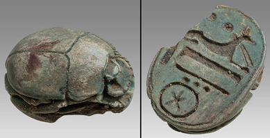 Ancient Egypt, Third Intermediate Period, c. 1070-747 BC. Rare faience scarab, the base with a standing figure of stg Osiris before the head of Khnum wearing tripartite headdress. L: 18.5mm. Ex Rilling estate, Orange County, CA. A really cool scarab! #AE3251: $475 SOLD