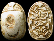 New Kingdom, c. 1550-1070 BC. Great steatite scarab, the base engraved with a lion and a boat. L: 12mm. White tone, nice deep-cut detail. Ex Royal Athena Gallery, NY. #AE3146: $350 SOLD