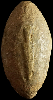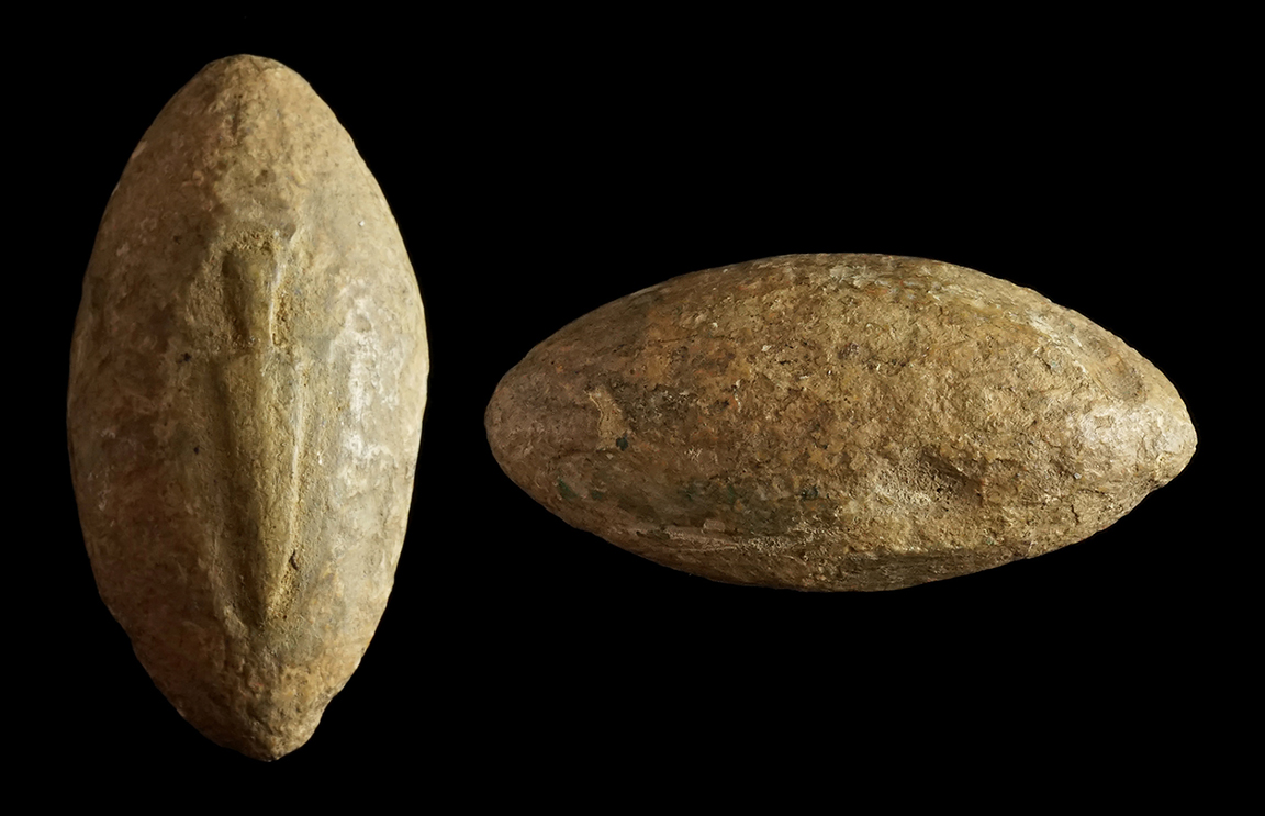 Ancient Greece, 5th-2nd century BC. Bronze arrowhead. Bi-lobate and barbed type (leaf-shaped with 2 blades). Enlarged hole likely made a screeching-whistling sound when hurtled through the air to strike fear upon the enemy. Olive-green patina with heavy earthen deposits. 29 mm (1 1/8"). Intact. #WP2106: $125 SOLD