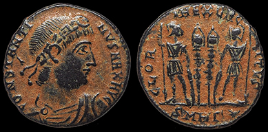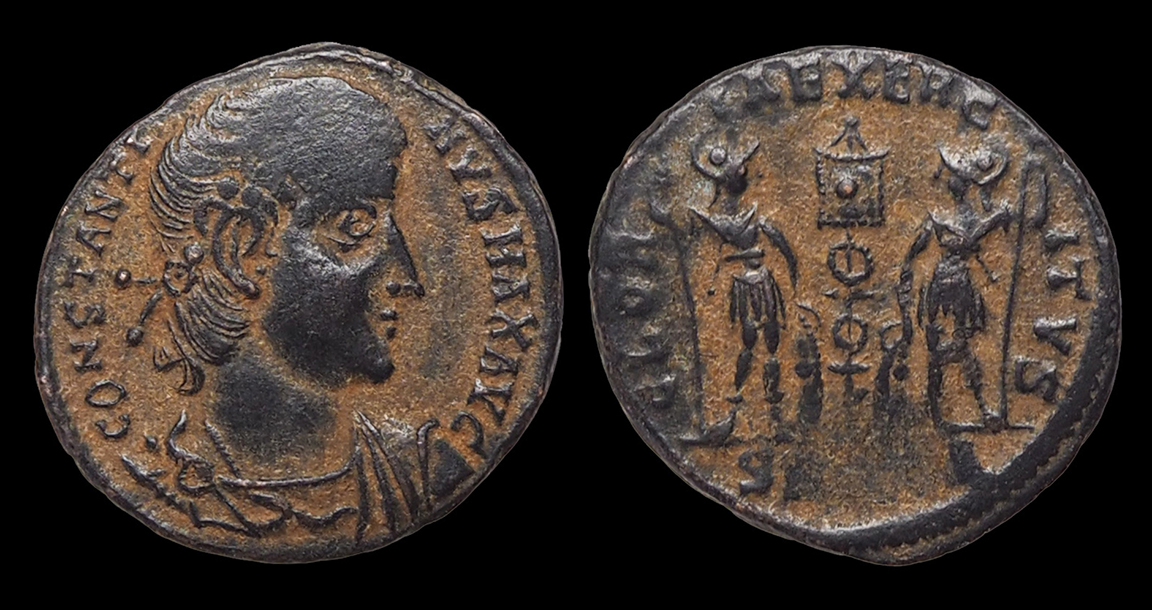 Constantine I the Great. Bronze coin. His rosette-diademed, draped, cuirassed bust right, CONSTANTINVS MAX AVG / Two soldiers holding spears and shields with two military standards between them, GLORIA EXERCITVS, A-SIS = Siscia mint. 18.5 mm. Nice glossy black tone. Great detail! #15461: $99 SOLD