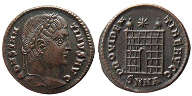 His laureate bust right, CONSTANTINVS AVG / Roman castle camp-gate with two turrets, star above, PROVIDENTIAE AVGG. B-SIS (crescent) below = Siscia mint. Nice lustrous black tone. 19 mm. A gorgeous coin! #14958: $125 SOLD