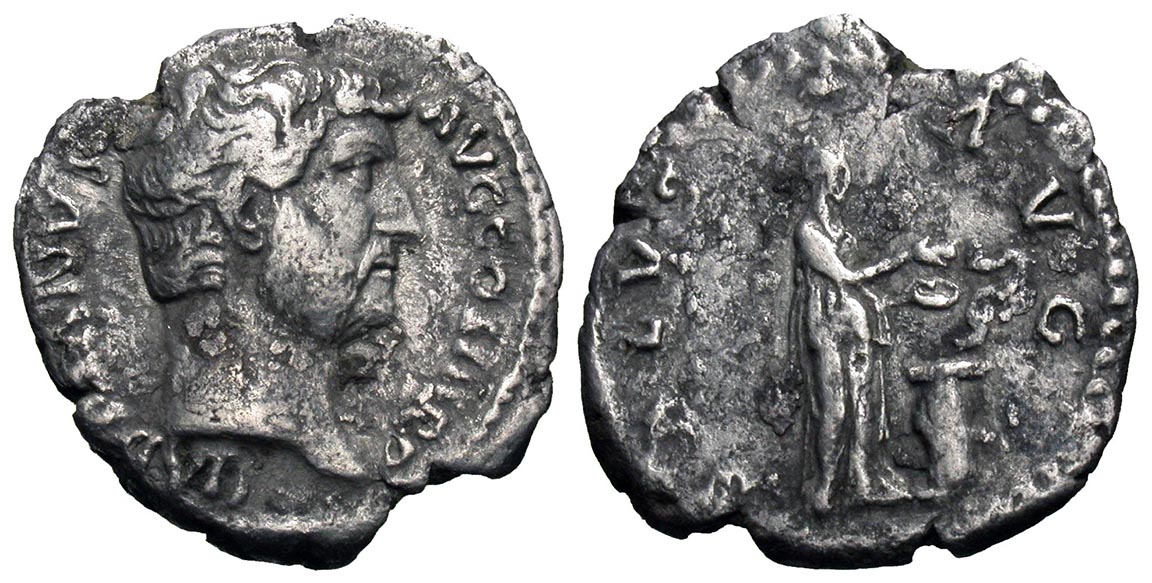 Ancient Rome. Marcus Aurelius, 161-180 AD. Silver denarius struck 168-169 AD, set into custom silver bezel. His laureate head right, M ANTONINVS AVG TR P XXIII / Salus standing left, holding sceptre and feeding serpent rising from altar, SALVTI AVG COS III. 18.5mm total diamter. ref: RSC 543, RIC 207. Coin ex-Miami, FL collection. #CR2951: $199 SOLD