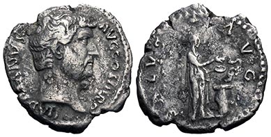 Diva Faustina the Elder, c. 141-150 AD. Empress to Antoninus Pius (shown at right ---->). Silver denarius. Her draped bust right, DIVA FAVSTINA / Fortuna standing left holding globe and rudder, AETERNITAS. 19 mm, 3.29 g. ref: RIC 348, sear5 4577, RSC 6. #CR2760: $80 SOLD