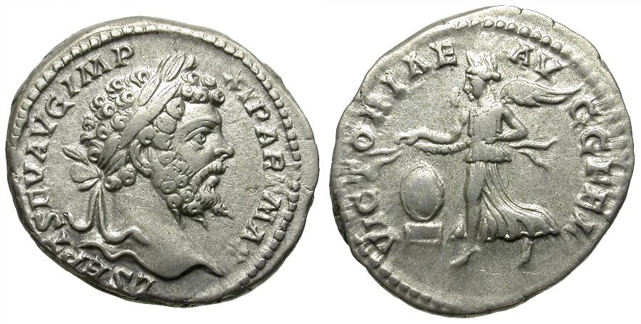 Ancient Rome. Septimius Severus, 193-211 AD. Silver denarius, struck 202 AD. Set into a stunning custom .925 silver bezel. His laureate head right, SEVERVS PIVS AVG / Victory walking left, holding wreath and palm, VICT PART MAX. ref: RSC 744, RIC 295, Sear 6372 for type. Total bezel diameter 25mm. Excellent, sharp detail, wonderful contrast. Nice cabinet tone not evident in the photos. A lovely coin! Coin ex Los Angeles, CA private collection. #CR3243: $275 SOLD