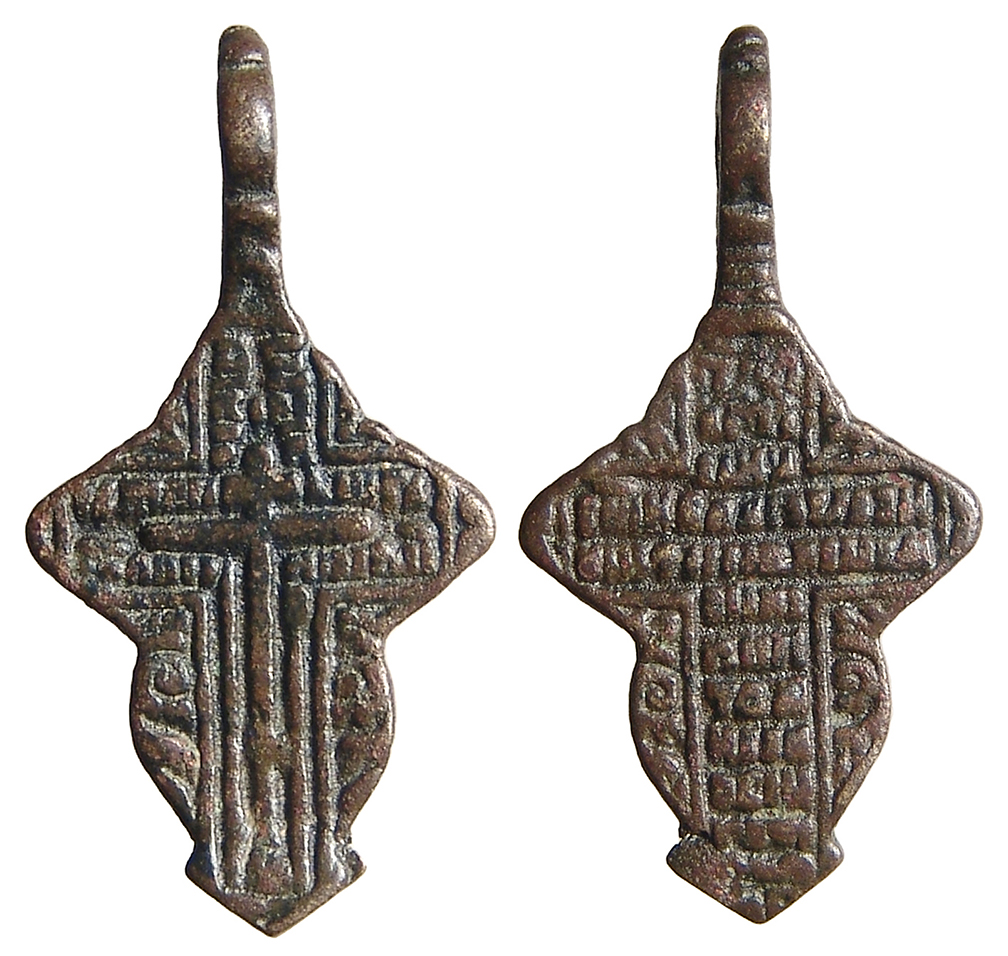 Late Medieval Europe, c. 17th-18th century AD. Gorgeous Russian Imperial bronze cross pendant. A Russian Orthodox cross, Latin inscription to sides, Cyrillic text above and below. L: 28mm, suspension loop intact. Ex Los Angeles, CA collection. #JM2442: $99 SOLD