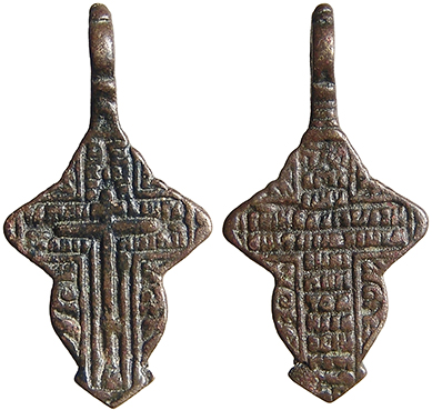 Late Medieval Europe, c. 17th-18th century AD. Neat Russian Imperial bronze cross pendant. The front with a tall ornate Russian Orthodox cross, Latin inscription around; the other with Cyrillic text within a central cross. L: 38mm, thick intact suspension loop. Ex Los Angeles, CA collection. #JM2439: $125 SOLD