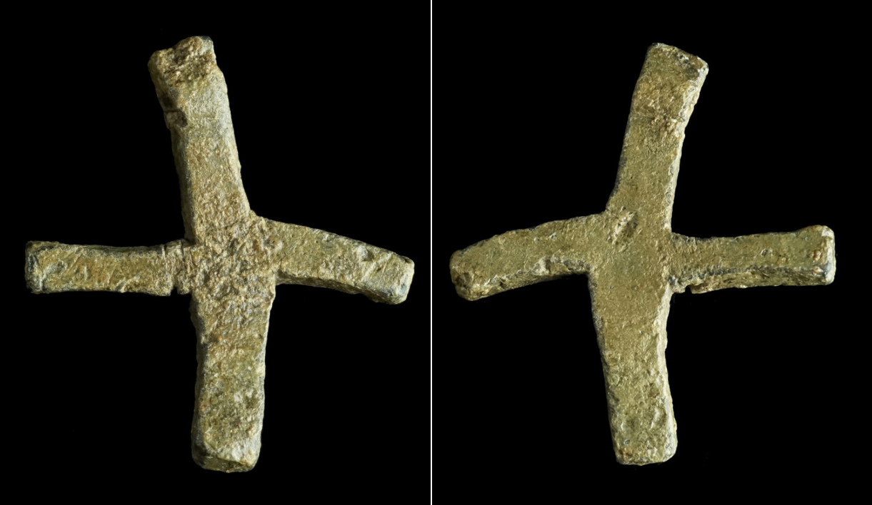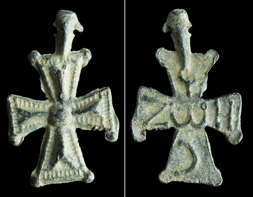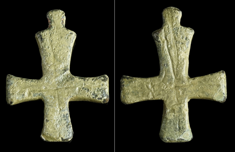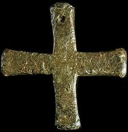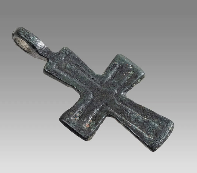 Medieval Europe, c. 8th-11th century AD. Small bronze cross engraved with a "cross-within-cross" design. Suspension loop lost in antiquity. Brassy/olive-green patina. H: 31 mm