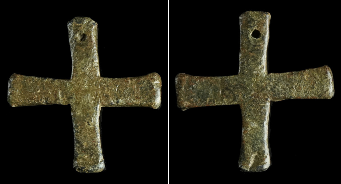 Medieval Europe, c. 6th-8th century AD. Bronze cross pendant. Decorated with punched-dot "Five Wounds of Christ" design and ornate terminals. Olive-green patina with earthen deposits. 40 mm