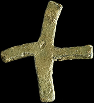 Medieval Europe, c. 8th-12th century AD. Small bronze cross pendant. Equal-ended cross with 4 pronounced raised lobes at the terminals; the square central element with a small "X" on both sides, mostly worn away. 25x17mm, suspension loop intact but a bit bent in antiquity. Ex New Jersey collection. #JM2548: $99 SOLD