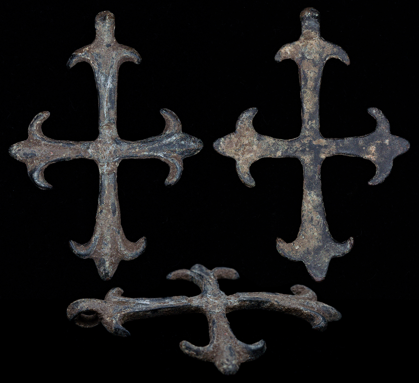 Medieval Europe, c. 9th-12th century AD. Bronze cross pendant, decorated with "cross-within-cross" design, small Latin cross at center. H: 42 mm (1 11/16"), great green patina under earthen deposits. #JM2264: $225 SOLD