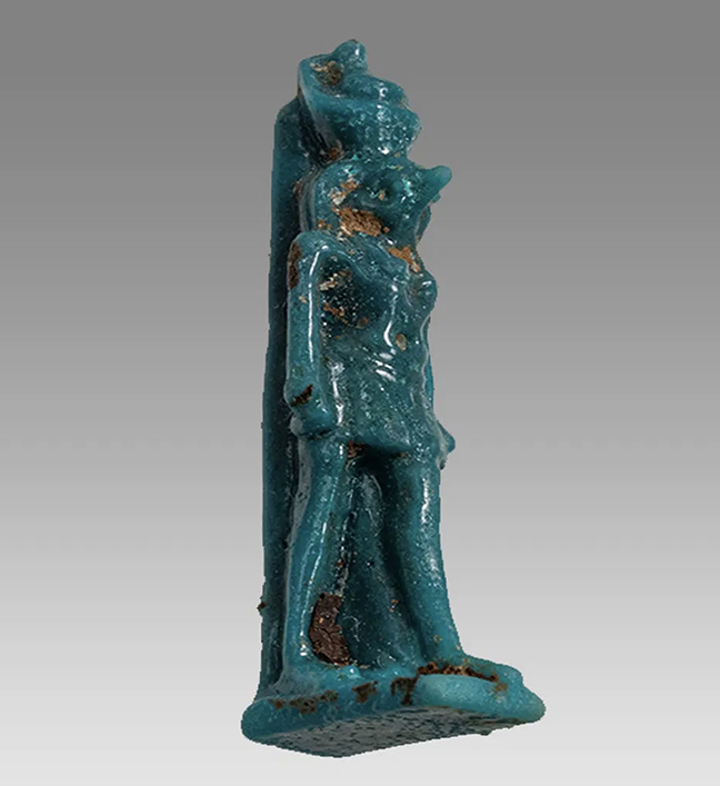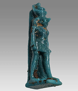 Ancient Egypt, Late Dynastic Period, c. 664-332 BC. A vibrant blue amulet of the Ram god Knum. Amazingly the bronze rings contained within are from ancient times as well, indicating that this amulet might have been won on a pendant or similar in ancient times! L: 13mm. Ex B. McDowell estate, WI, purchased at Sotheby's in 1965. #AE3342: $250 SOLD