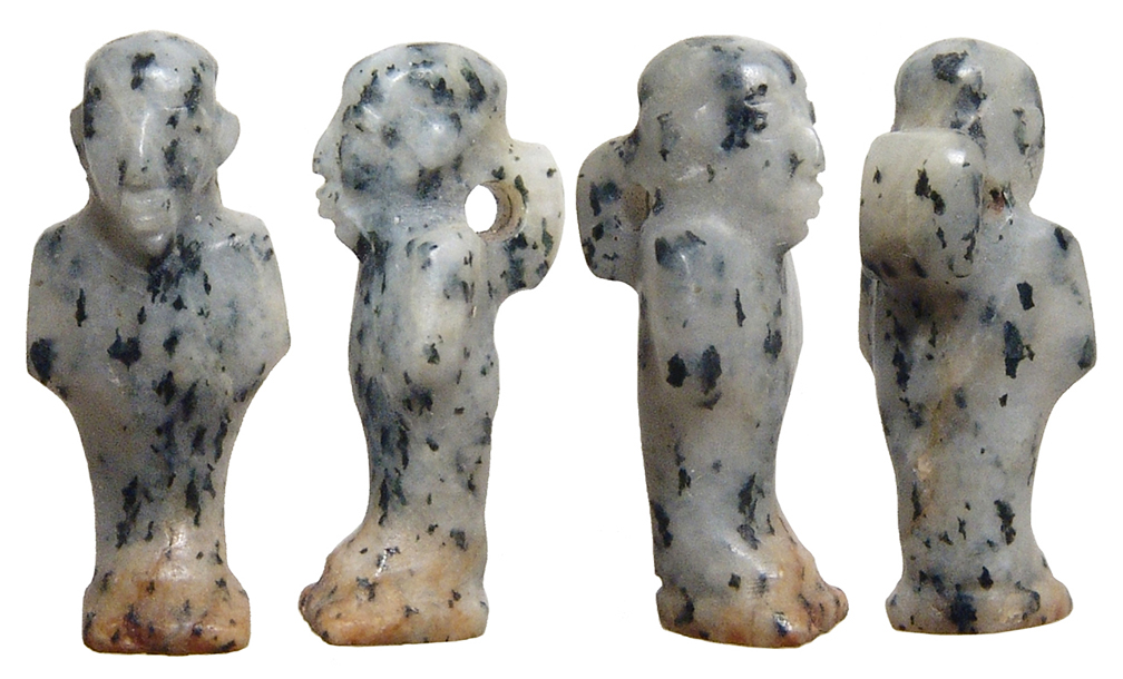 Ancient Nubia! c. 2nd century BC. An incredibly rate carved stone amulet of a standing deity, wearing an elaborate hairdo. This is the only Nubian amulet I have ever had, and In shoukd probably keep this one for my own collection! H: 20mm. Ex P. Vigil estate collection, New Mexico, primarily acquired from Argosy Art & Artifacts between 3/4/1985 and 5/9/1986. #PV040: $250 SOLD