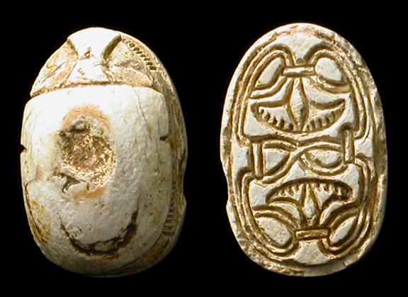 New Kingdom, 1570-1070 BC. Steatite scarab, engraved with Isis wearing plumed headdress. L: 13 mm. Repaired, with chipped edges, but beautiful style! Ex New York collection. #AE2637: $399 SOLD