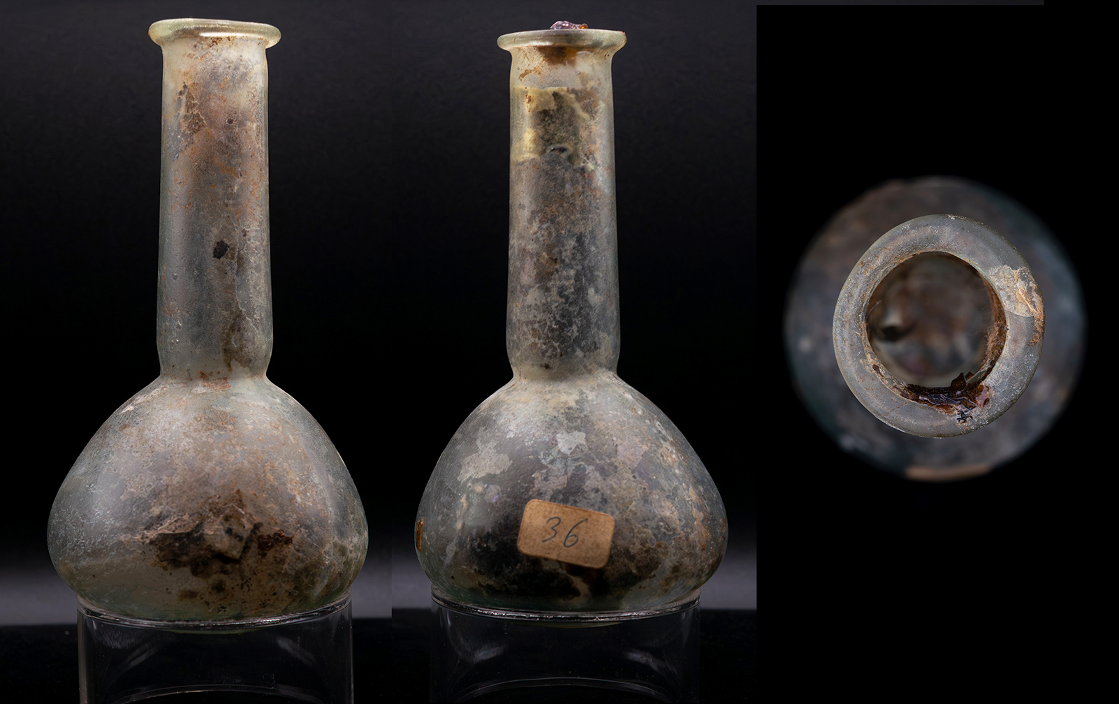 Holy Land, Roman period, c. 1st Century AD. Lovely light green glass "tear vial" bottle. With an ovoid body, tall neck, and uneven rim. A light coat of ancient dirt on interior and exterior. lovely iridescence on the exposed areas. 3 1/4" (80 mm). Ex South Yorkshire, England private collection. Mounted on nice custom stand. #GL2008: $399 SOLD