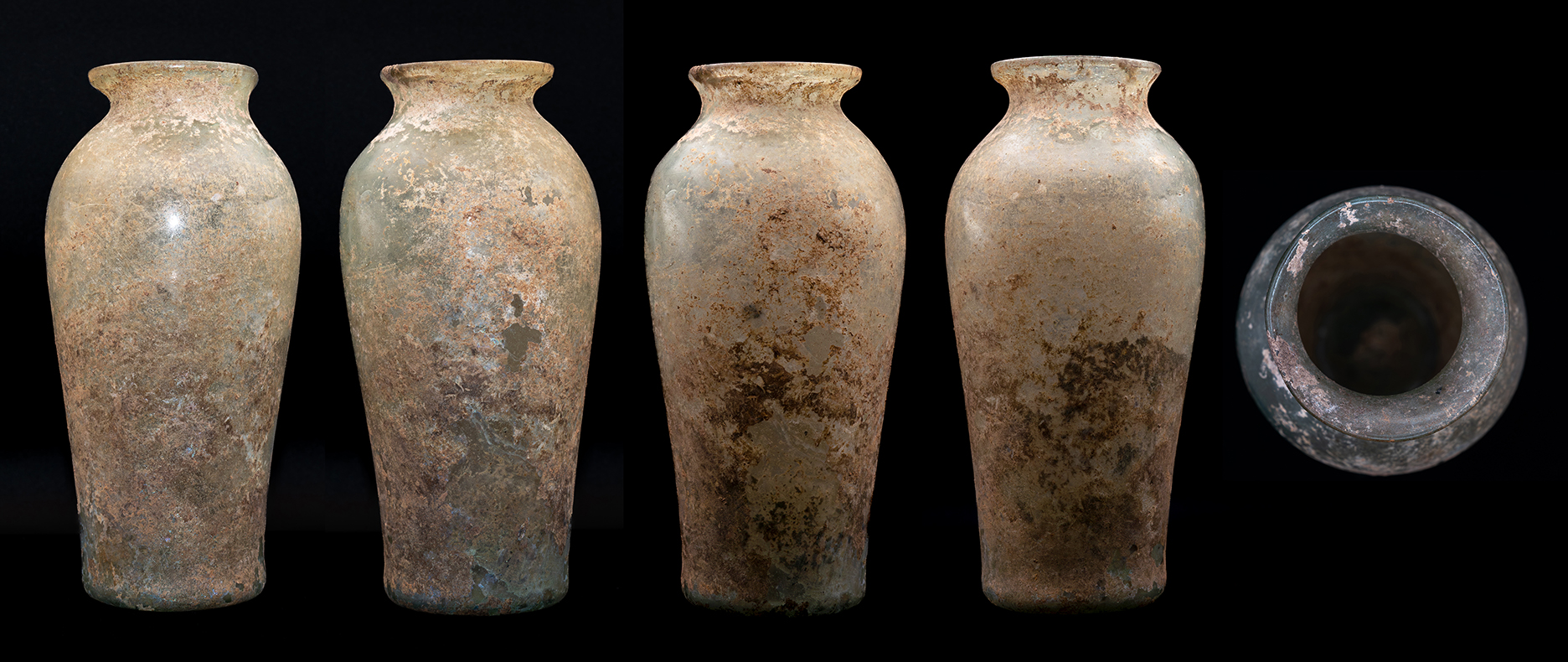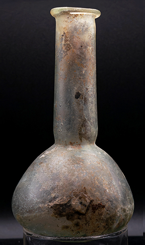 Holy Land, Roman period, c. 1st Century AD. Gorgeous and tall light blue glass "tear vial" bottle. Nice color with great iridescence, with round body and indented base, the neck tubular with flattened rim folded inward. Stands 152 mm (just under 6") tall. Small loss to top and tiny 3mm hole toward bottom of body, otherwise intact with some light earthen deposits. ex-I.M. Chait Galleries; ex-Los Angeles, CA private collection. #GL2002: $375 SOLD
