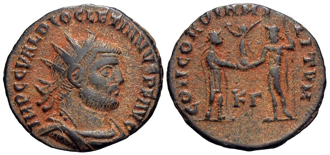 Ancient Rome. Diocletian, 284-305 AD. Bronze antoninianus, set in custom gold bezel. His radiate, draped and cuirassed bust right, IMP CC VAL DIOCLETIANVS AVG / Diocletian standing right, holding parazonium, receiving Victory from Jupiter standing left, holding sceptre, CONCORDIA MILITVM; A in lower center. ref: RIC V 256, Cohen 33 for type. Olive-green patina with earthen highlights. Total bezel diameter 20mm (15/16"). Ex Los Angeles, CA collection formed in the 1970’s-1980’s. #JN2339: $299 SOLD