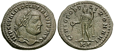 Ancient Rome. Diocletian, 284-305 AD. Large bronze Follis struck 295-296 AD, Cyzicus mint. His laureate head right, IMP CC VAL DIOCLETIANVS P F AVG / Genius standing facing, head left, holding cornucopia, pouring liquor from patera, GENIO POPV-LI ROMANI; KΓ in exergue. 29.59mm, 10.62 grams. ref: RIC VI 10a Cyzicus for type. VF. From the Ellery Johnson Collection; ex Marc Breitsprecher, classical numismatist. #CR3668: $145 |