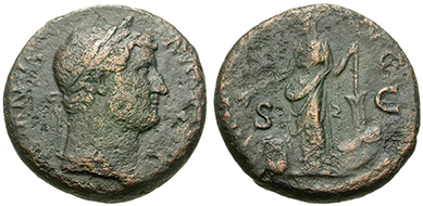 Ancient Rome. Hadrian, 117-138 AD. Large bronze As, struck 134-138 AD. His laureate head right, HADRIANVS AVG COS III P P / Annona standing left holding ears of grain over modius, rudder in left hand over prow of ship; S-C across fields, ANNONA AVG. 24.67mm, 11.54 g. ref: RIC II 796 Rome for type. Good Fine++. From the Ellery Johnson Collection; ex Marc Breitsprecher, classical numismatist. #CR3667: $150 |