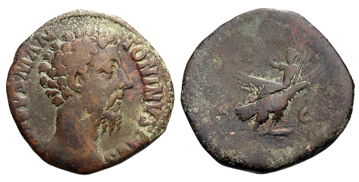 Ancient Rome. Divus Marcus Aurelius, 161-180 AD. Large bronze sestertius struck 180 AD under Commodus, deifying him. Bare head of Marcus Aurelius right, DIVVS M ANTONINVS PIVS / Marcus Aurelius reclining left on an eagle which stands upon a thunderbolt, raising right hand, CONSECRATION SC. 30 mm, 19.57 g. ref: RIC 660, Cohen 94 for type. Ex New Jersey collection. #CR3585: $175 |