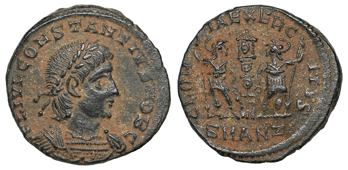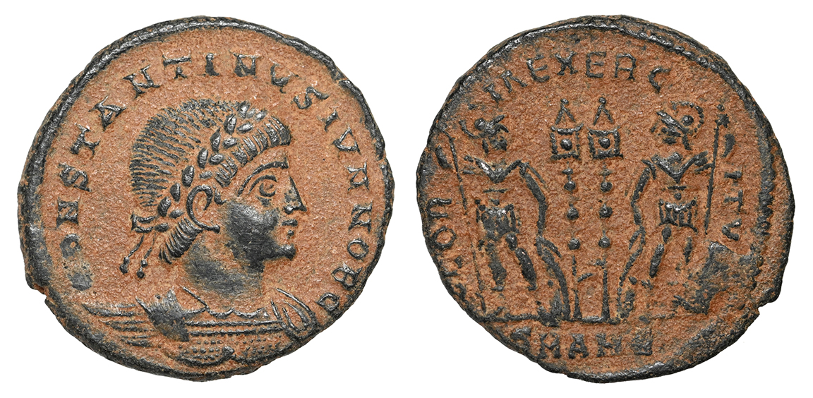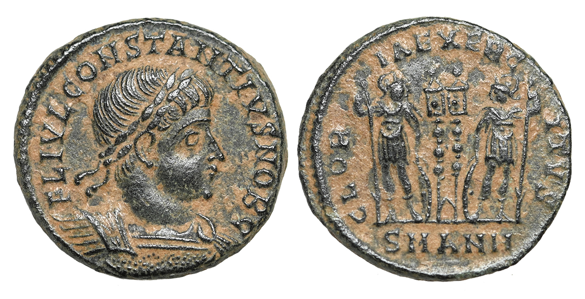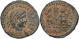 Constantine II, 337-340 AD. Bronze follis, Antioch mint, struck 330-335 AD. Laureate, cuirassed bust right, CONSTANTINVS IVN NOB C / Two soldiers holding spears and shields with two standards between them, GLOR-IA EXERC-ITVS. Mintmark: SMANH. 17 mm, 2.61 g. ref: RIC VII Antioch 87. Nice green patina. #CR2208: $99 |
